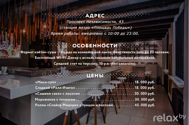 Есть в меню и пиво: японское «Iki» с имбирем или зеленым чаем, а также «Asahi super dry» обойдется в 37. 000 рублей (0,44 л). Немецкий «Paulaner» стоит 40. 000 рублей (0,33 л), «Pilsner Urquell» — 33. 000 рублей (0,3 л), «Corona» — 40 000 рублей (0,35 л), «Guinness» — 45 000 рублей (0,33 л), «Аліварыя» – 25 000 рублей. В конце весны появятся смузи, молочные коктейли, а барная карта пополнится крепким алкоголем.