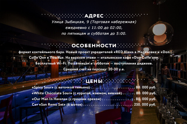 Работает бар ежедневно до 2:00. Заместитель директора уверяет: даже если вы придете за пятнадцать минут до закрытия — официант примет заказ по меню (кухня здесь работает до последнего клиента). К слову, меню идентично соседнему «Don Coffe’on»: это первое в Минске «Паста меню», а также горячие блюда итальянской кухни из мяса и рыбы от шеф-повара Олега Чирика. Что же касается бара, то им руководит Валерий Бураченок.