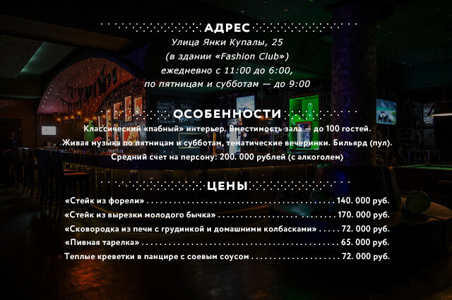 Стоимость горячих блюд в пабе не превышает 230. 000 рублей: стейк из форели здесь можно заказать за 140. 000 рублей (180 г), стейк из вырезки молодого бычка — за 170. 000 рублей, сковородка из печи с грудинкой и домашними колбасками — за 72. 000 рублей (350 г). Колбаска в беконе с картофельным пюре обойдется в 50. 000 рублей (350 г), а пельмени собственного приготовления на сковородке можно попробовать за 35. 000 рублей (250 г). К слову, в заведении немало сковородок с белорусскими вкусами.