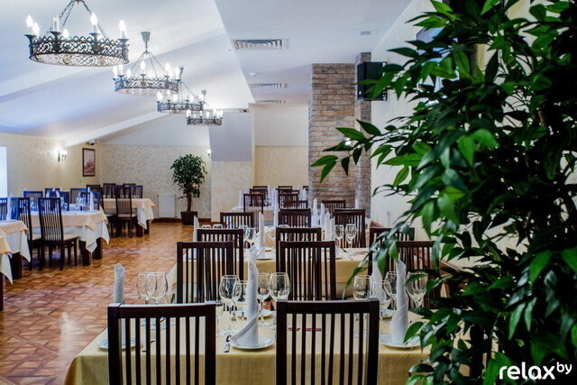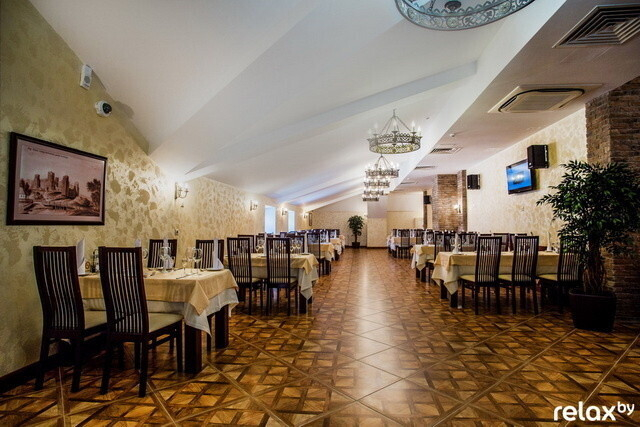 | ОЛЬГА: «Интерьер ресторана выдержан в стиле самой гостиницы. Как обязательный элемент — сводчатые потолки и использование натурального дерева. В духе XVII–XVIII века выполнены и массивные люстры». |