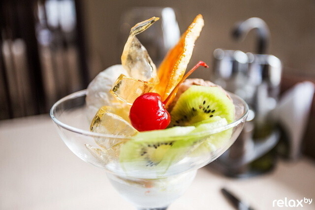 На десерт — мороженое с шоколадным сиропом, ананасом и вишней (56 000 рублей), с карамельным сиропом и черешней (52 000 рублей) и с темным шоколадом (50 200 рублей).