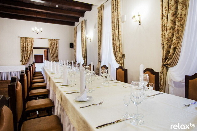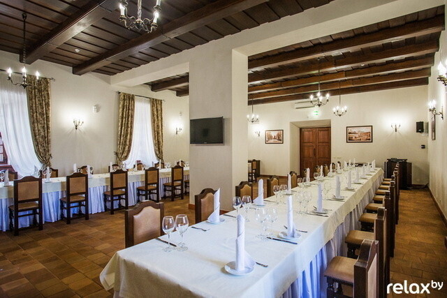 Помимо основного зала, в ресторане работает банкетный: декор здесь менее аскетичный, на стенах — картины с росписями, характерными для XVII-XVIII веков. Потолки выполнены из натурального дерева, окна — современные стеклопакеты, но делались для комплекса по специальному заказу.