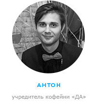 | АНТОН, УЧРЕДИТЕЛЬ: «Мы стремимся создать у нас в кофейне максимально уютную, домашнюю и одновременно рабочую атмосферу. У нас можно прийти и спокойно поработать за чашкой кофе, посидеть за книгой или просто пообщаться, получить море позитива и посмотреть, как люди творят в соседней комнате. Мы не хотим, чтобы наш клиент отвлекался на Интернет». |