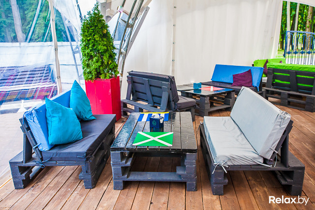 Описывая интерьер, можно смело причислить его к стилю эко: натуральные материалы, мебель из поддонов, декорированная мягкими подушками, и явный минимализм.