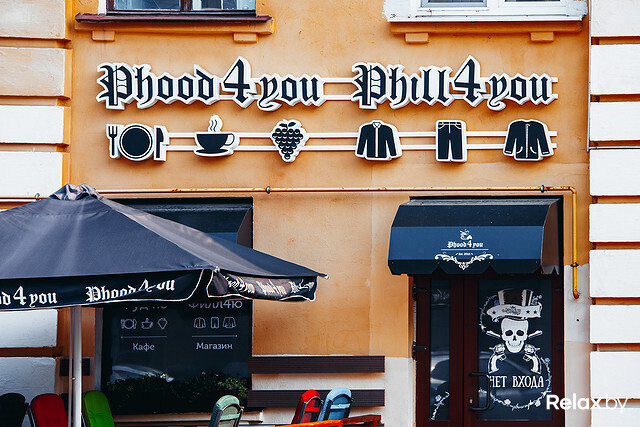«Phood 4 you, Phill 4 you» — это попытка совместить в одном здании кафе и бутик. Два помещения отделены друг от друга стеклянной стеной и оформлены в схожем сдержанном стиле, «чтобы ничего не раздражало».