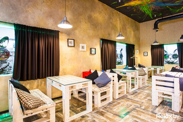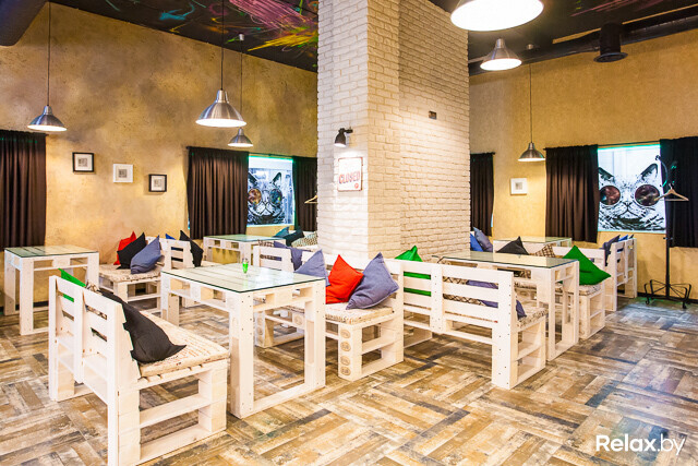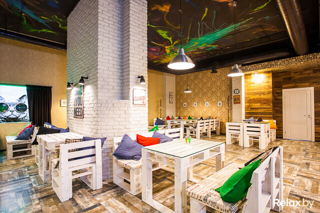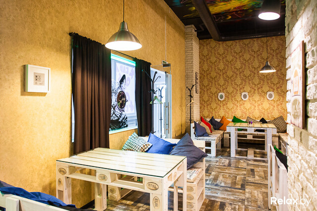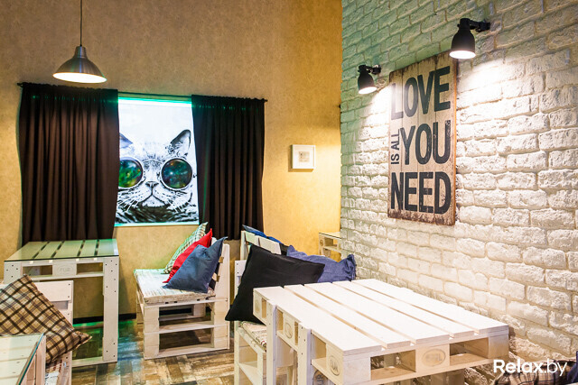 Создатели не выхватили из «Хэмингуэя» разрезанных бензопилой манекенов и вбитых в потолок стульев. Лофт или индастриал вокруг — сказать сложно. Кроме котов в хипстерских очках на стеклах, здесь еще мебель из поддонов с яркими подушками, кирпичная кладка, разрисованный четырехметровый потолок и стены.