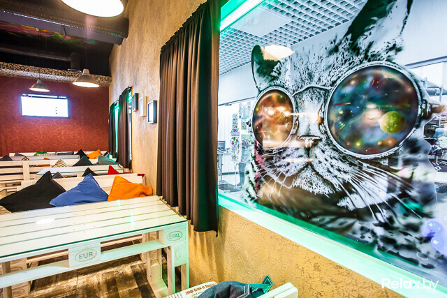 Кошачья тематика начинается еще до пересечения порога: коты здесь на окнах, а дальше — в рамках на стенах, принтах на подушках, названиях в меню. Идею создатели привезли из Вены, где есть ресторан, в котором живут 43 кота. Аналогичный формат в Минске не реален, но поощрить героя концепции решили: если здесь появятся гости с котами на поводке или в сумке, им обязательно подадут бесплатный кофе. Будут отмечать и всех, в чьей фамилии есть «кот».
