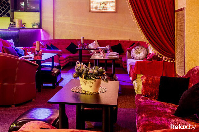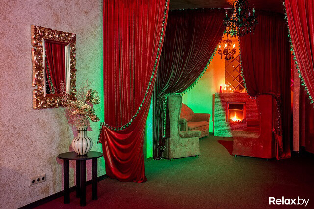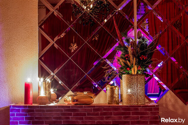В основном зале сможет разместиться 50 персон. Есть столики на разное количество мест, включая угловые с диванами для компаний побольше. Кроме основной есть еще небольшая каминная или lounge-зона, отделяемая тяжелыми красными шторами с кистями.