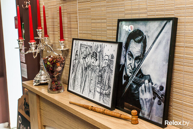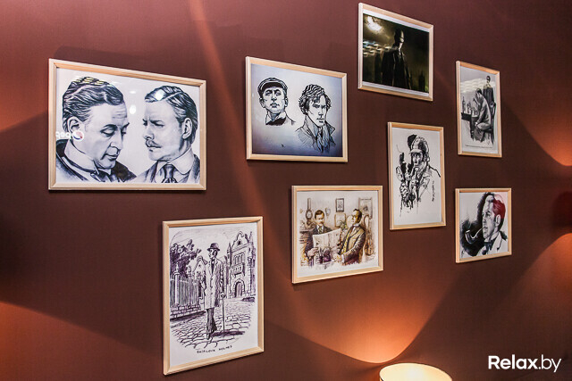 На стенах заняли свое почетно-предсказуемое место картины с Шерлоком и репродукции снимков, сделанных в XIX веке. Рядом расположился экран, который без звука показывает советские фильмы об известном сыщике. Но если гость пожелает, картинка «заговорит».