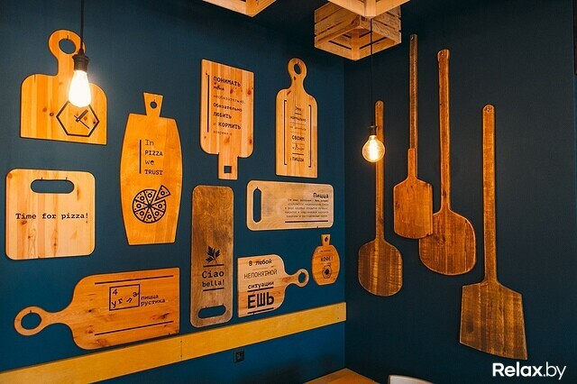 Проследить указанную в имени «рустику» можно, заглянув в само заведение: вся мебель здесь (как и стеллажи, а также многочисленные элементы декора) — из натурального дерева. На полках на стенах красуются склянки с ингредиентами. Одна из стен усыпана деревянными подносами, на каких принято подавать пиццу в Италии.