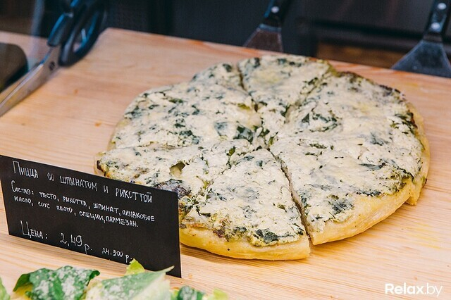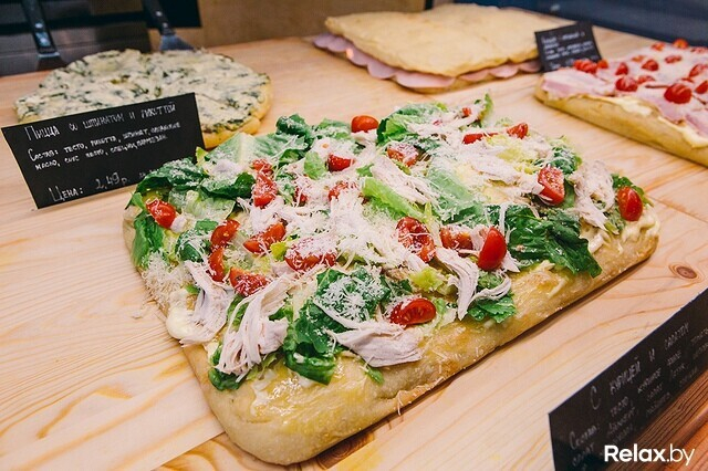 Цены вполне доступные. Диапазон — от 0,99 (9 900) до 2,49 (24 900) руб. за 100 грамм в зависимости от начинки. Здесь уже успели проследить: чаще всего гостю достаточно кусочка в 100–150 грамм, однако есть и те, кто заказывает целую пиццу, вес которой колеблется от 3 до 3,5 кг. Кроме пиццы здесь предлагают салаты, сэндвичи, брускетты, хлеб и выпечку.