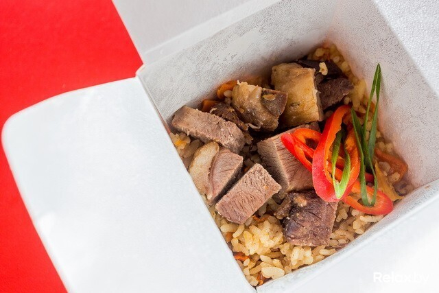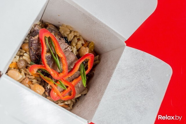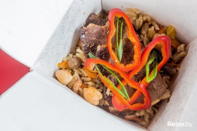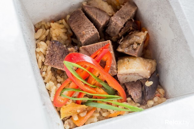 Сочный плов «Праздничный» делают с рисом Лазер, мягким мясом ягненка, желтой (узбекской) и красной морковью, луком, нутом, изюмом, барбарисом и ароматными восточными специями. Relax.by оценил сочетание добавок: насыщенное блюдо достойно пробы.