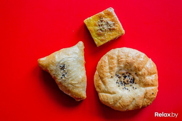 Похвалы заслужила и треугольная самса с ягненком: по совету создателей, откусив кусочек, мы залили внутрь аутентичную узбекскую аджику: выходит очень интересно. Кстати, скоро в меню появится еще самса с тыквой: такую весьма любят в Узбекистане; нас уверили, что ее обязательно нужно попробовать. Узбеки все едят с хлебом, так что еще одна обязательная позиция в меню — традиционная круглая лепешка. Не обошлось и без восточных сладостей: попробовали очень достойную пахлаву.