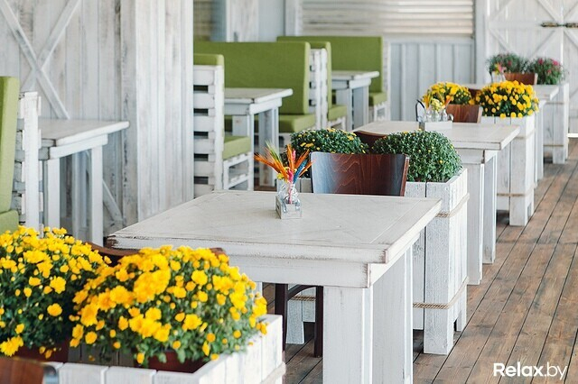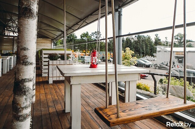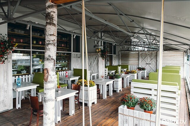 Гостей встретит также уютная веранда, залитая светом. За некоторыми столами вместо стоящих стульев висят качели.