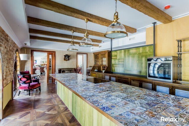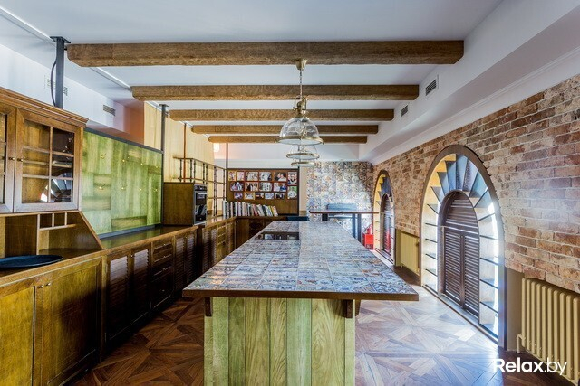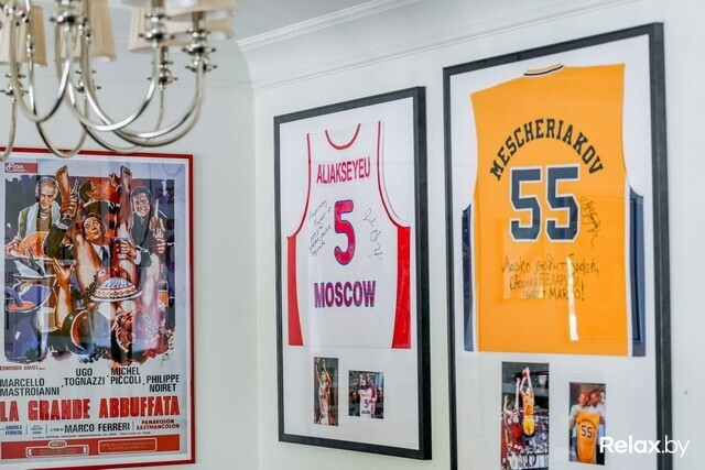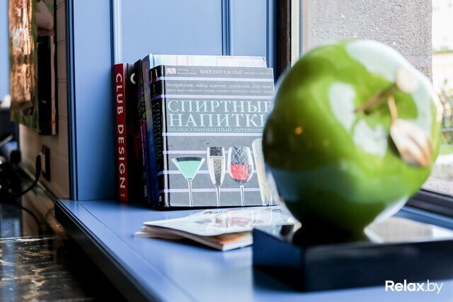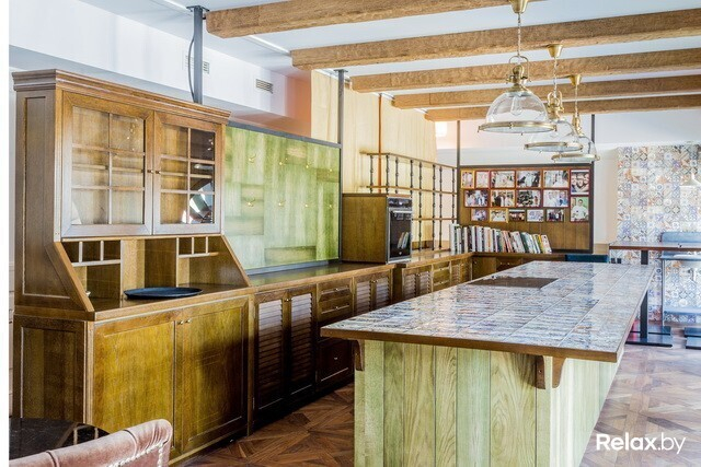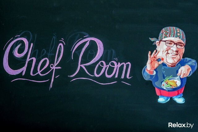 Шеф-рум, предназначенный для небольших банкетов, дегустаций и мастер-классов, заставлен кулинарной литературой и увешан фотоснимками Марко с поварами и друзьями, имеющими отношение к гастрономической индустрии. Огромный стол с плитой для обучения собран из ярких маленьких плиток.