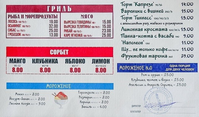 Ценовой сегмент — средний: сытный ужин обойдется не более чем в 60 (600 тысяч) рублей. Конечно, в меню есть и дорогие блюда — те, что готовятся из премиальной продукции. В целом, стоимость здесь обуславливает сырье: Марко заверил нас, что принципиально выбирает продукты исключительно хорошего качества.