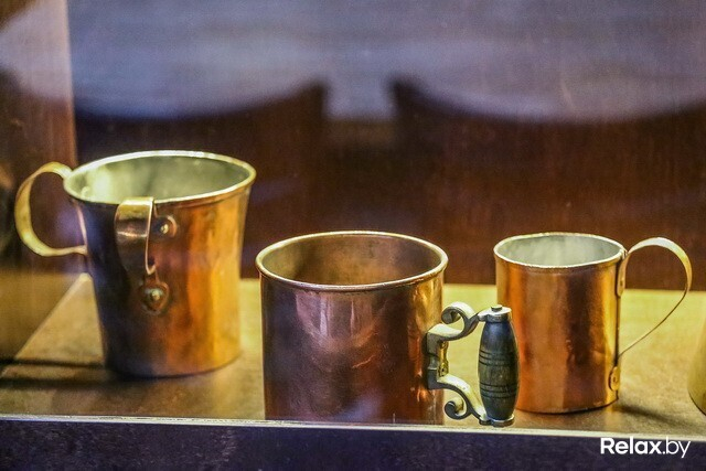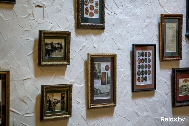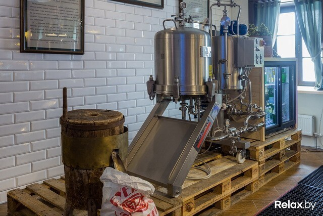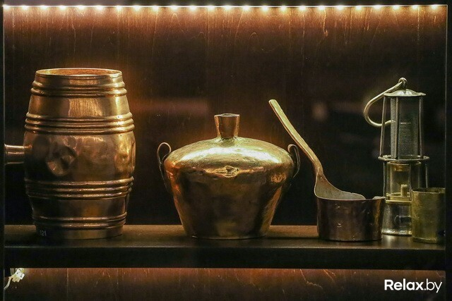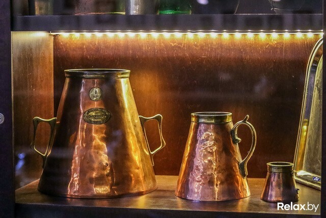 Просторный зал-музей показывают с особой гордостью: в нем собраны эксклюзивные старинные тематические экспонаты (XIX-XX веков) из частной коллекции Евгения Шигалова. В шести «окнах» покоятся детали импровизированных лабораторий (весы, ступки для обработки солода и хмеля, сосуды, в каких отстаивали дрожжи), кружки и бокалы из меди и латуни, сосуды для торговли (с тех самых времен, когда пиво продавали ведрами) от польских, российских и белорусских мастеров, бутылки всевозможных цветов и форм. Даже самогонный аппарат есть! Здесь же местами в стенах оставили «пробоины», из которых выглядывает кирпичная кладка: где-то совсем старинная, где-то чуть свежее, а в некоторых местах и вовсе юная, закрепленная металлическими балками — как говорят в заведении, «культурное наслоение в наглядном виде».