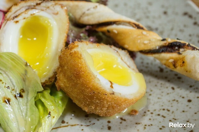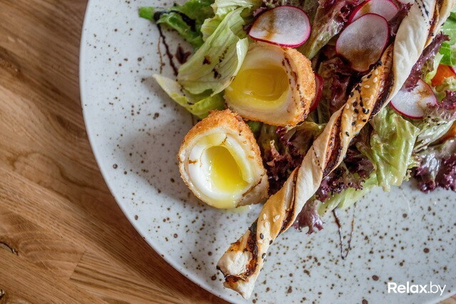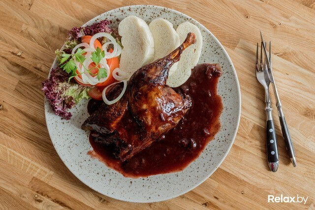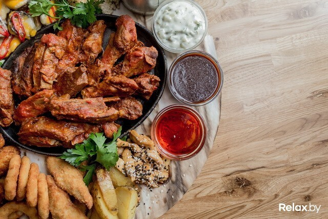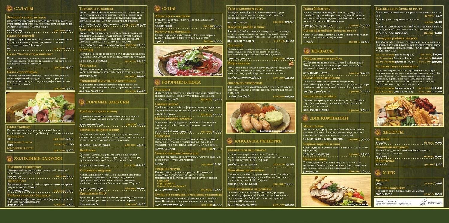 В ресторане предлагают классическую пивную кухню в авторской обработке. Безусловно, есть тут и чисто классические позиции, но большинство — модифицированы бренд-шефом заведения. Множество блюд готовится с участием местного пенного напитка: они тушатся в нем или подаются с пивным соусом. Каждые 1,5-2 месяца в сети будут проходить фестивали: станут презентовать новый сезонный сорт пива, а к нему — от 3 до 10 новых блюд не из меню (к примеру, фестиваль бургеров, колбасок или ребер), которые впоследствии сменятся другими. Удивлять эффектной подачей не стремятся, зато уверяют, что приятно шокируют объемом порций.