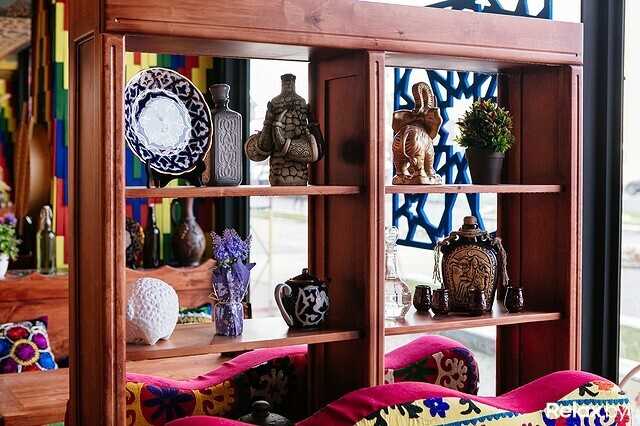 Вся мебель в ресторане, занимающем два этажа и около 1500 м2, сделана из дерева под заказ, вышивка на креслах и диванах — ручной работы. Ткани для обивки везли из Узбекистана, посуду, тюбетейки для персонала, светильники и люстры — из Турции и также из Узбекистана.