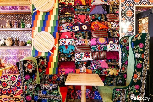 Рассматривать интерьер заведения можно бесконечно: здесь и загадочные восточные лампы, и мягкие разноцветные подушки с вышитыми тонкой нитью узорами, и яркие принты на стенах, и старинная посуда на шкафчиках, использующихся в качестве перегородок между зонами зала, и самовары с чайными сервизами, выполняющими роль светильников, и необычные кальяны и мешочки со специями. Кажется, что в «Чайхона Базар» ни одного сантиметра не оставили без внимания, не превратив его в часть декора, подчиненного общей идее загадочного и гостеприимного Востока.