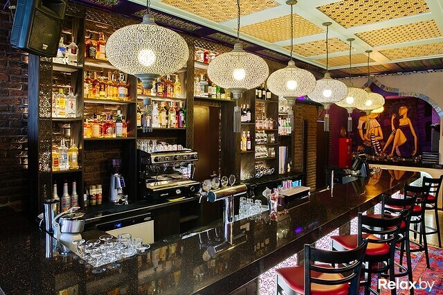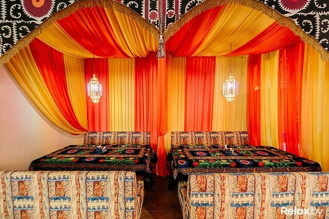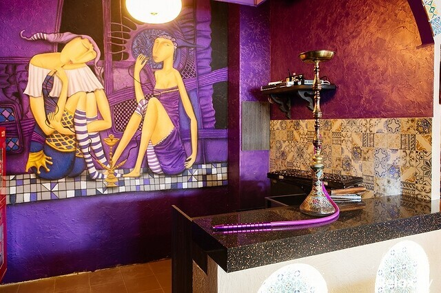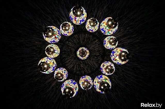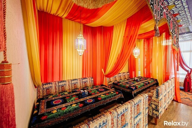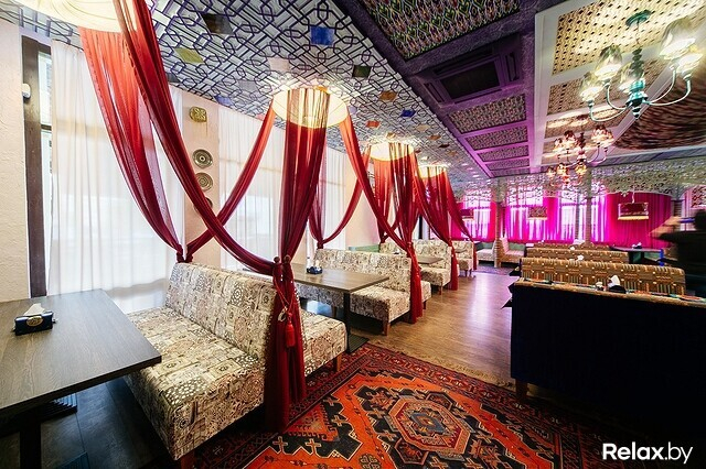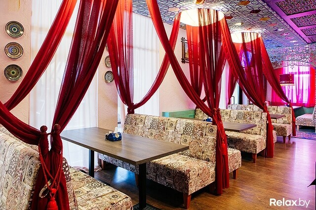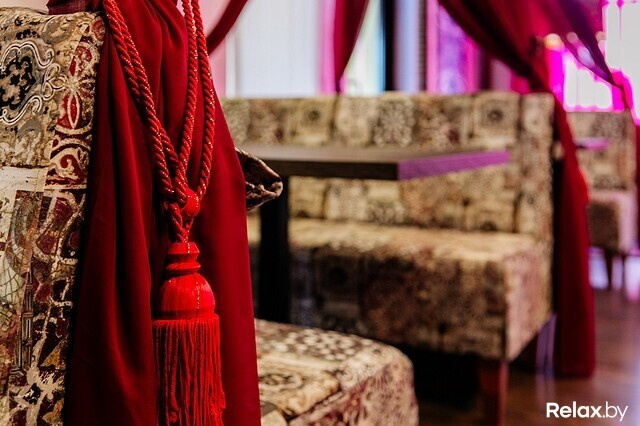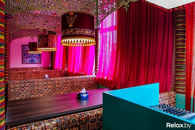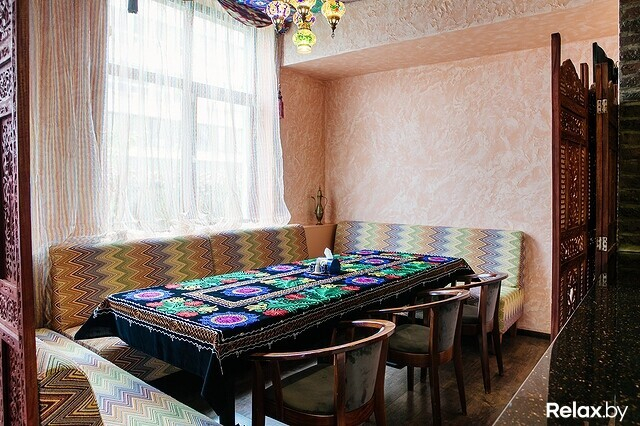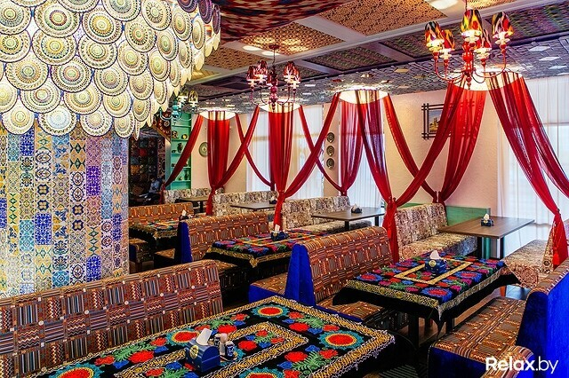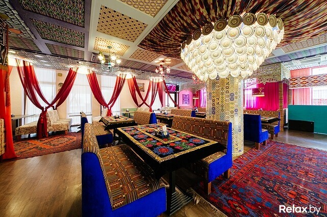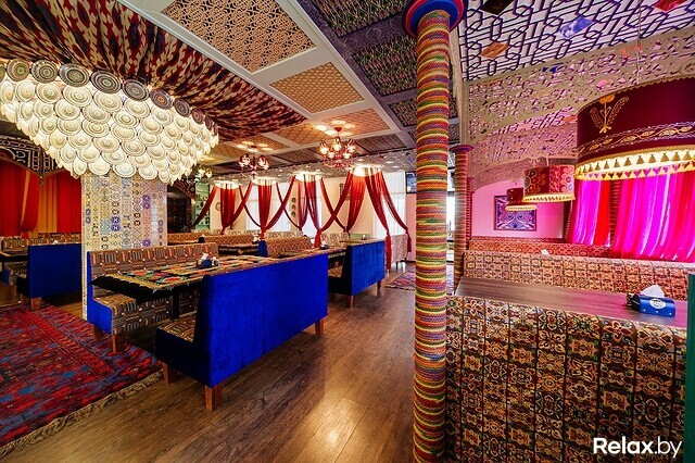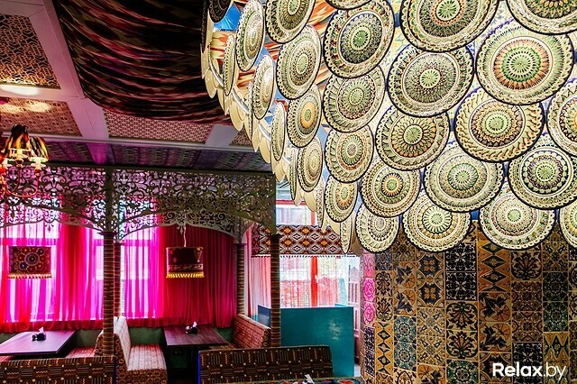 В интерьере сохранили корпоративный стиль: атмосферу здесь так же, как и в других заведениях сети, создают вручную расшитые подушки и раскрашенные тарелки, а также специально привезенные узбекские ковры. Зал здесь один большой на 100 гостей, однако он отличен длинным контактным баром и небольшим кальянным: здесь можно пообщаться с профессиональным кальянщиком, понаблюдать за его занятием, покурить.