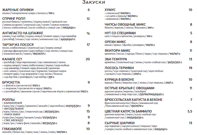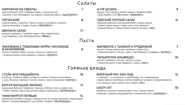 Кухня в новом заведении смешанная: есть европейские позиции и стрит-фуд-блюда. Полноценное меню (в каком найдутся, например, «Спринг ролл», салаты «А-ля Цезарь» или теплый «Тайский», стейк «Ала пиццайола» и бургер «Большое яблоко») планируют обновлять раз в несколько месяцев.