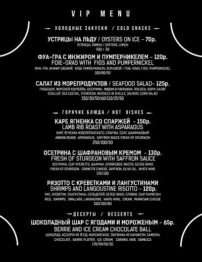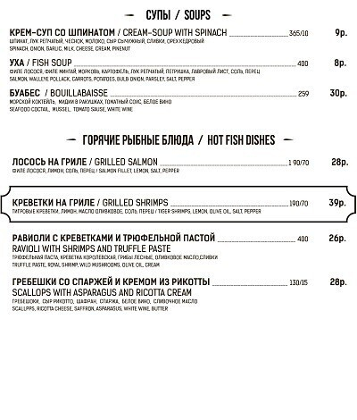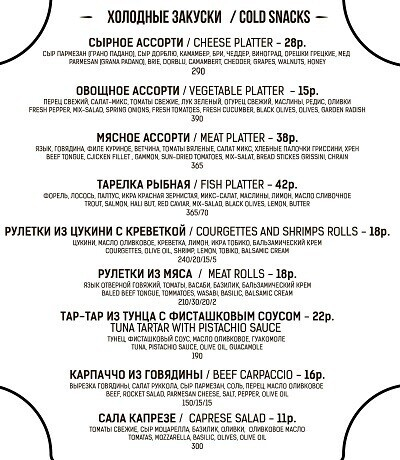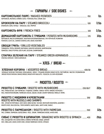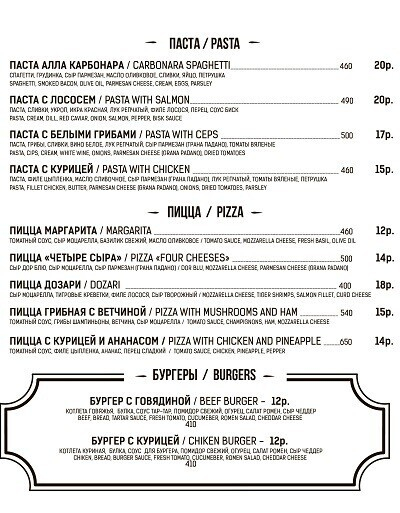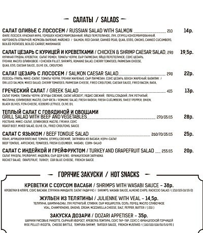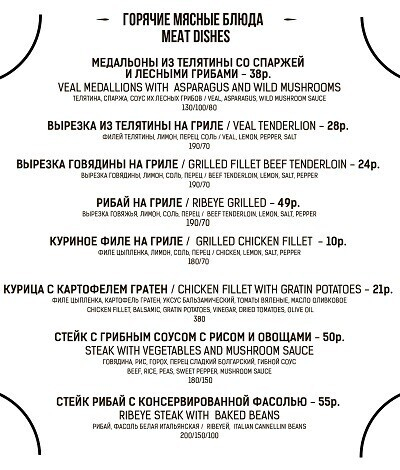 Меню здесь тоже смешанное (но преимущественно состоящее из позиций европейской кухни). Найдутся самые популярные и любимые минчанами блюда: паста, пиццы, бургеры, роллы и многое другое. Создатели говорят, гости порой просят здешнего шеф-повара приготовить что-нибудь эдакое, а тот не отказывает.