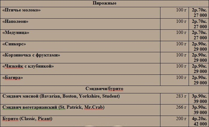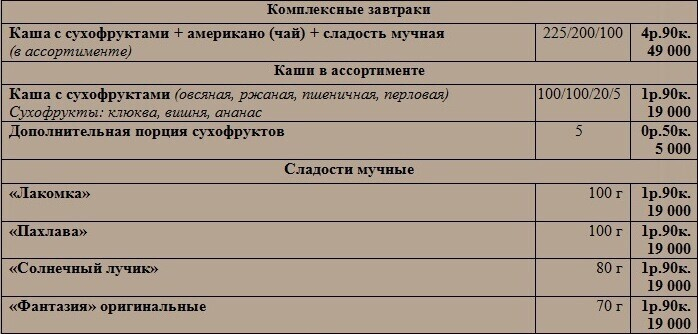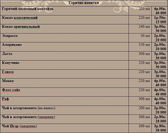 В небольшом меню заведения — каши с сухофруктами на завтрак, сэндвичи по авторским рецептам, свежие пирожные и мучные сладости, приготовленные из натуральных продуктов, и, конечно, широкий выбор напитков. Любители чая найдут здесь более 20 различных его сортов, а кофеманы смогут побаловать себя традиционными или авторскими смесями.