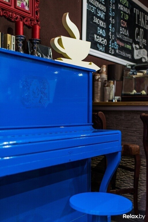 Интерьер заведения — классика в современном исполнении. Цвета использованы преимущественно теплые, бежево-шоколадные, однако встречаются и авангардные акценты в виде ярко-лазурного пианино.
