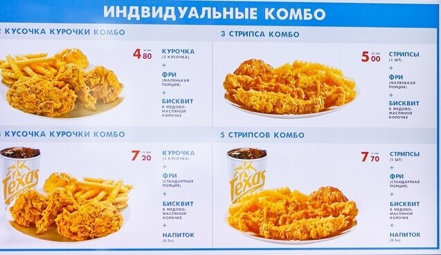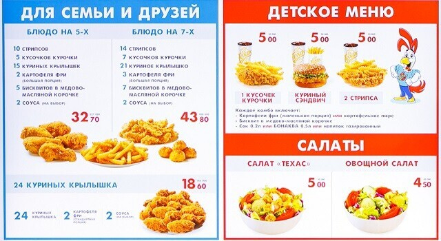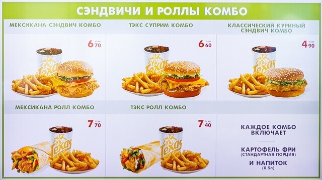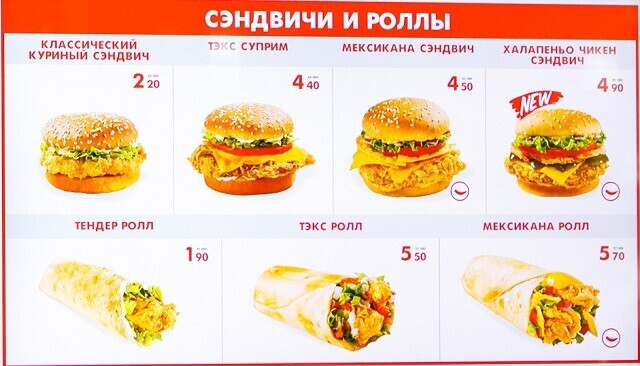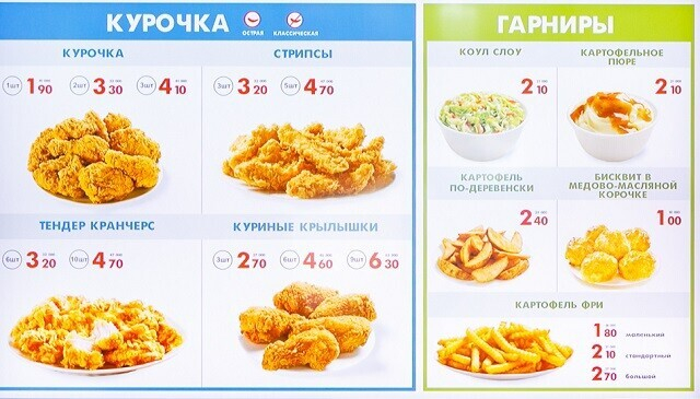 Что касается еды, тут есть несколько отличных от конкурентов предложений. Кроме знакомых бургеров (крайне рекомендуем попробовать острый «Халапеньо»), роллов, картошки фри и по-деревенски, мороженого в рожке и стакане с топпингом, тут есть ещё пюре с соусом, а на сладкое — бисквит в медовой корочке и шоколадный торт. Кстати, согласно сетевым правилам, тут работают только с охлажденной курицей (категорически против разморозки). Меню во всей сети обзаводится новинками каждый сезон.