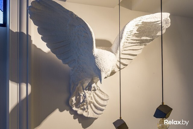 В баре действительно есть что рассматривать: много внимания уделено мелочам. На каждом шагу встречаются детали, созданные вручную. Например, одна из них — метровая объемная глиняная фигура пересмешника, вылетающего прямо из стены. Уютный бар рассчитан на 37 посадочных мест. Есть внушительная контактная стойка.