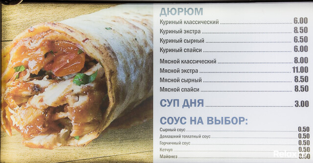 Повар в My Dear Kebab — из Турции, а потому и все блюда здесь с соответствующим колоритом. В меню — дюрюмы с различными начинками, сэндвичи, фалафель, тосты, картофель фри, блины, кебаб сеты и напитки. К любому блюду можно дополнительно заказать один из фирменных соусов, которые, как нам рассказали в заведении, готовят здесь по уникальным турецким рецептурам. Также в кебабшопе предлагают супы в стакане — удобно брать с собой.