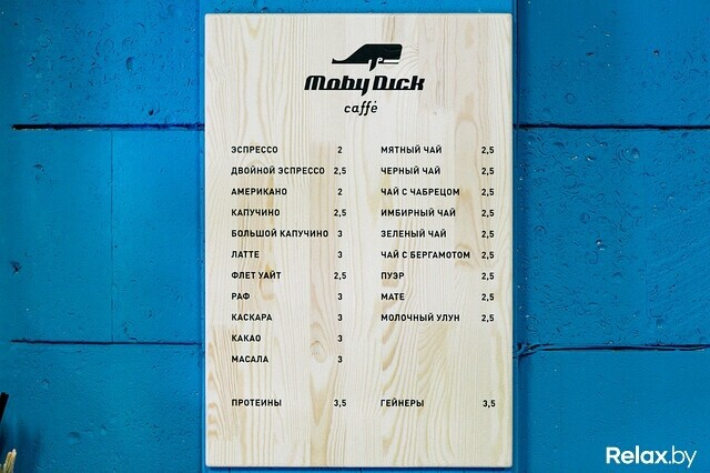 Кроме привычных эспрессо, американо, капучино и латте, в Moby Dick Caffé предлагают, например, каскару — напиток, приготовленный из оболочки кофейной ягоды, чай мате и масала, а также протеиновые коктейли и гейнеры для спортсменов.