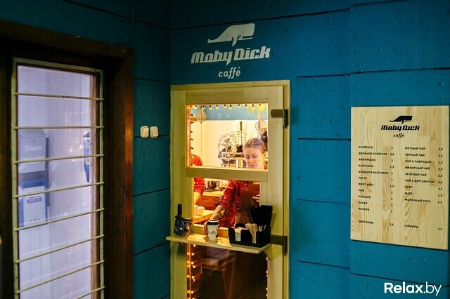 Moby Dick Caffé расположилось на первом этаже здания и представляет собой небольшое окошко, через которое можно сделать заказ и после забрать напиток. Кухни в новой кофейне нет, и ее появление не планируется, поэтому основной упор здесь делают на хорошие напитки. В дополнение к чаю или кофе можно взять разве что батончик.