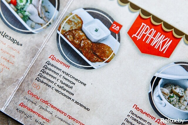 Помимо стандартных блюд вроде супов, пельменей и колбасок в меню «Дранiков» можно найти и такие предложения, как бигос, фляки, свиные уши и жареная килька. Как отмечает директор заведения, «для закусочной это достаточно сложные блюда», а потому новое место тяготеет к формату кафе.