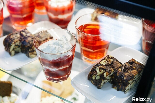 На витринах представлены уже готовые салаты, закуски и десерты. Горячие блюда в закусочной готовят сразу после заказа и достаточно быстро — ждать придется не более 10—15 минут.