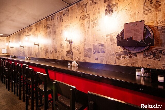 В новом «1067» два зала. В первом удастся разместиться за контактным баром или стойкой у стены, а также на высоких стульях за такими же столами.