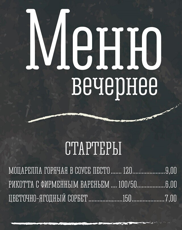 Среди основных блюд найдутся изысканные авторские предложения от местного шеф-повара: грудинка индейки с вишневым соусом и фундуком, куриная грудка в кисло-сладком виноградном соусе с сыром Моцарелла или креветки в белом соусе со шпинатом. Тут же, кстати, предложат попробовать спагетти с ягодами в сладком сливочном соусе. Любителей чего-то необычного приятно удивят антипасто — овощные, творожные, рыбные, мясные.