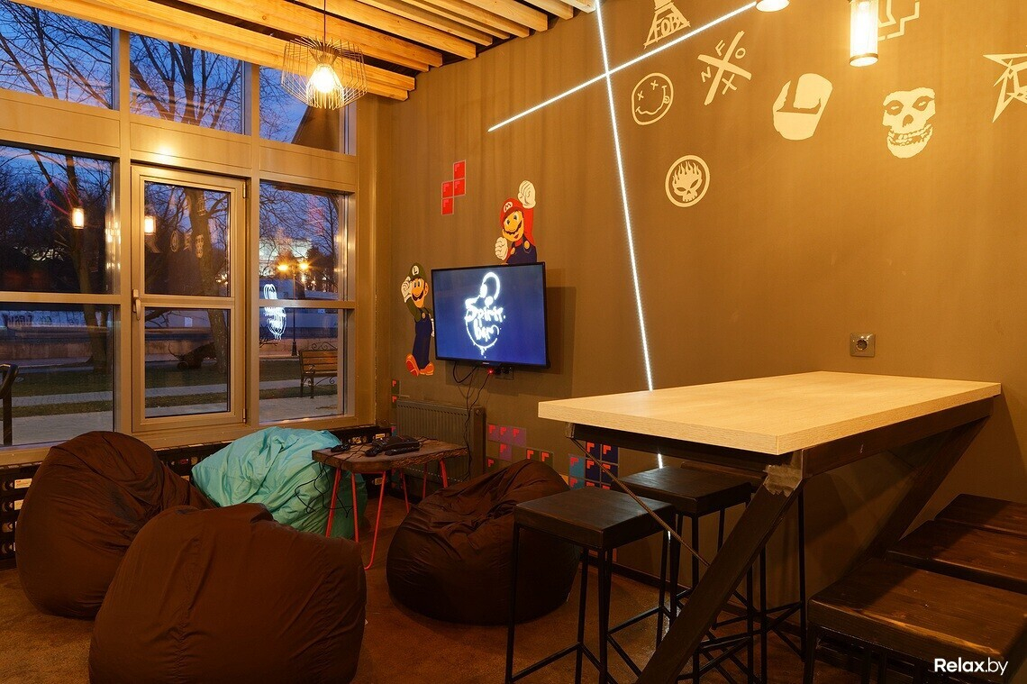 В баре 35 посадочных мест: есть П-образная контактная стойка с розетками для зарядки телефонов и нишей для сумок, а еще высокие барные столы со стульями и пухлые кресла-мешки в игровой зоне; присесть можно и на подоконник. Примечательно, что над баром установят камеру, которая в онлайн-режиме и со звуком станет транслировать местные вечеринки на официальный сайт.