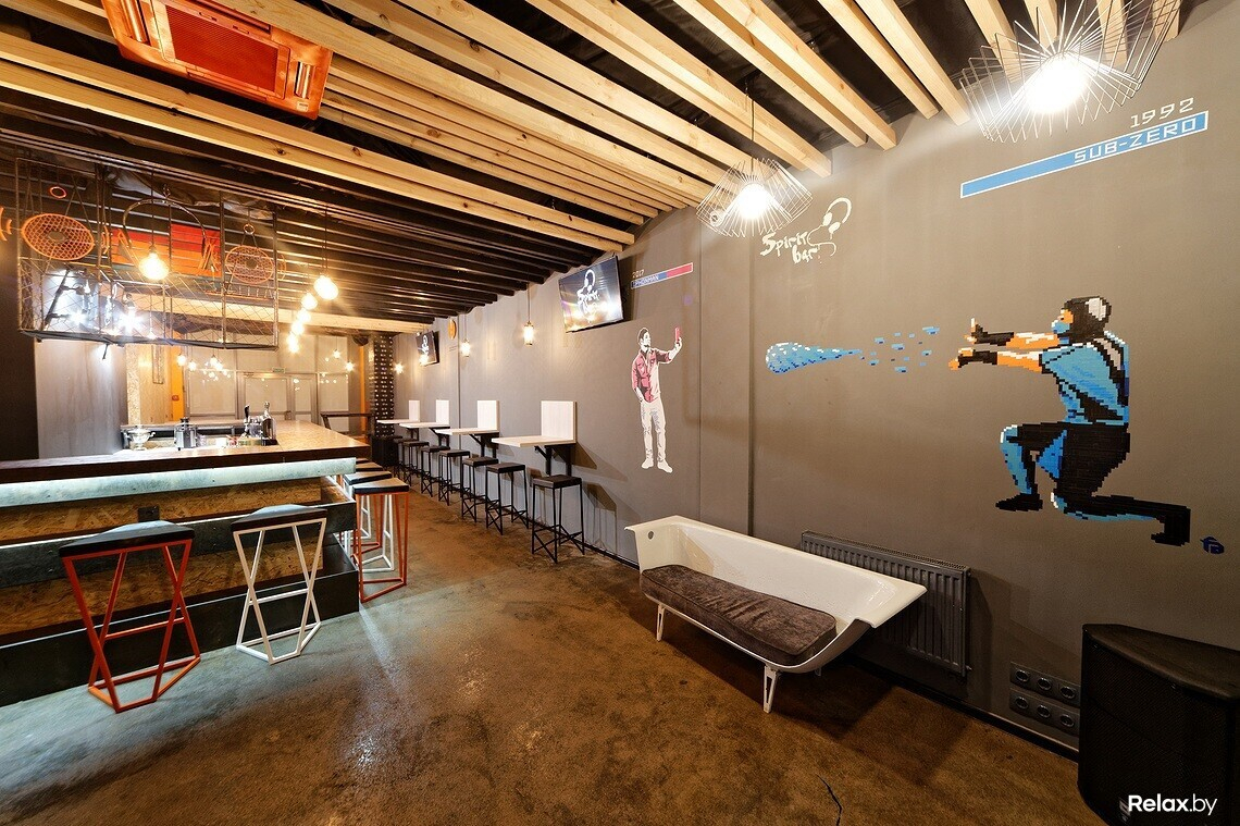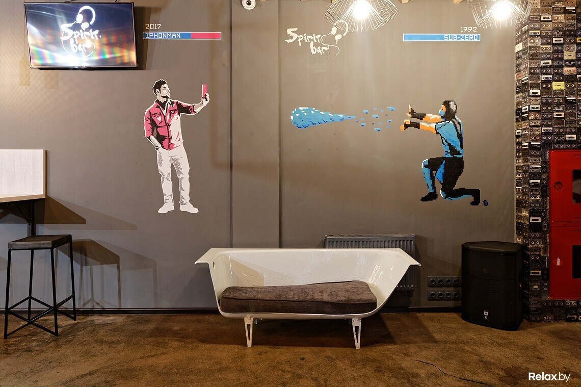 Можно без преувеличения заявить, что Spirit bar декорировали вручную: так созданы барные стулья и столы, висящие на цепях балки под потолком, вставки из видеокассет под окнами и рядом. Над баром висит «прокачанный» старый велосипед, в свое время проехавший от Минска до Киева. На стене — картина со смыслом, выполненная в европейской технике «тейп-арт» специальным скотчем: на ней пиксельный Саб-Зиро (персонаж игры Mortal Kombat) стреляет в современного так называемого «айфон-мэна».