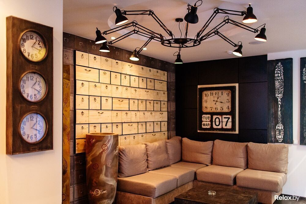 Убранством нового места занималась та же литовская компания, что оформляла уже существующие заведения владельцев. Здесь говорят, что во время строительства AnyTime интерьер перерабатывался трижды, обрастая новыми декорациями и меняя цвета, и в итоге получился довольно эклектичным по своей стилистике.