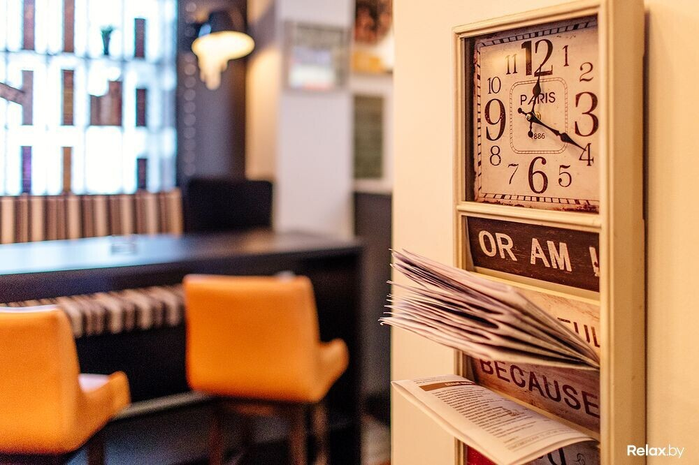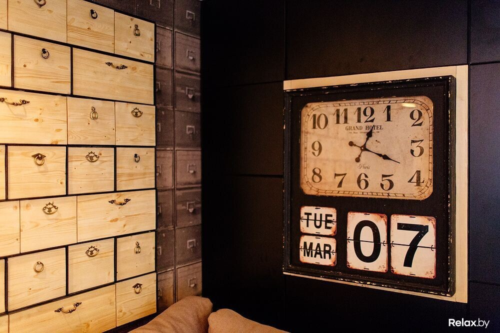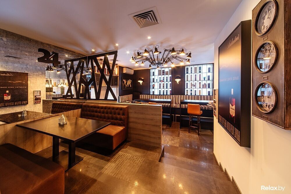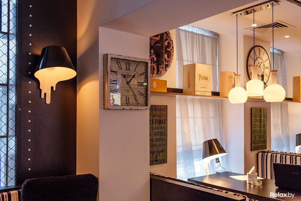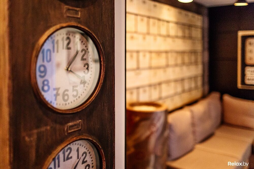 В большом заведении на 84 посадочных места найдется три зала с исключительно разной атмосферой. Акцент любого из них — необычные светильники. Примечательно также, что в новом месте нет ни одного твердого стула: либо пухлые диваны, либо стулья-кресла; даже барные обшиты кожей, под которой прячется что-то мягкое. Общим мотивом, отвечающим названию и концепции, тянутся по гастробару часы самого разного толка.