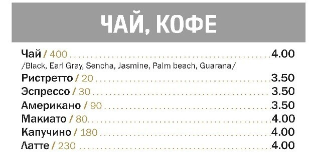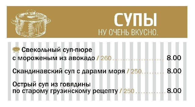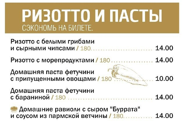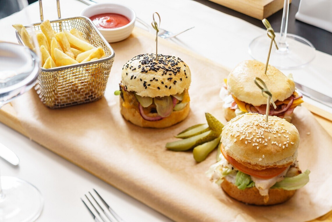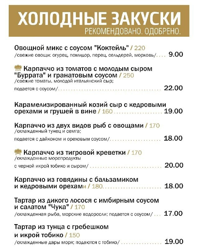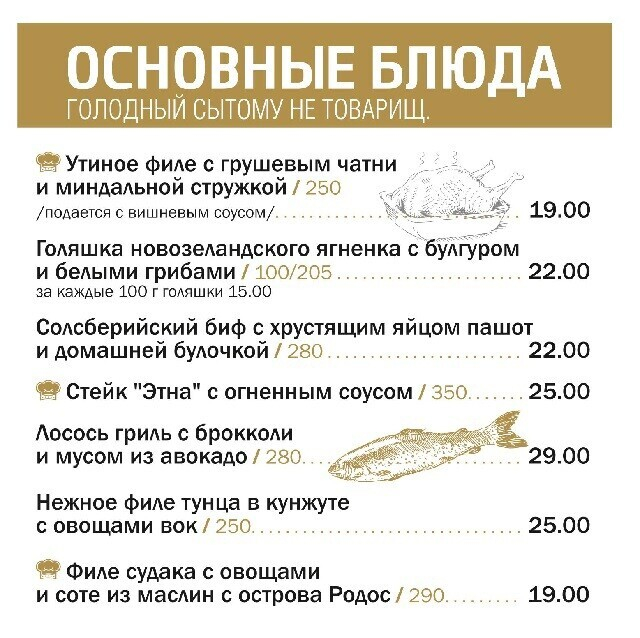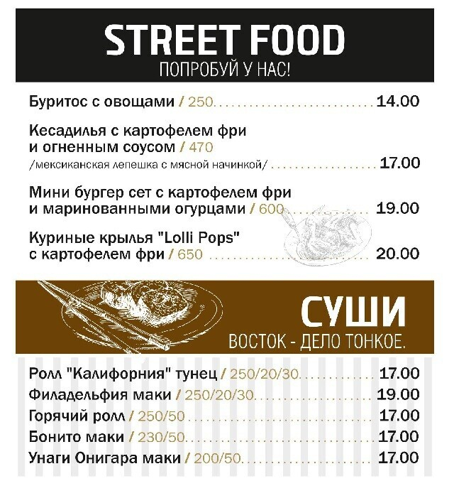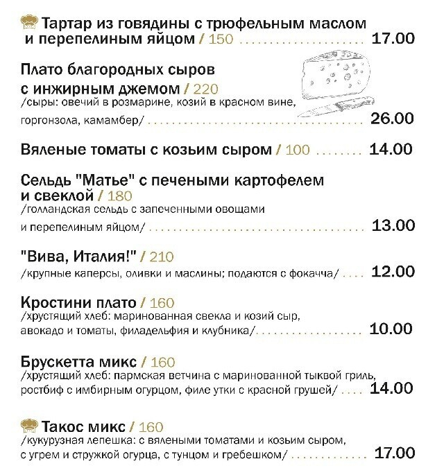 Основное меню поделено на тематические блоки, один из которых — «стритфуд»: найдутся привлекательные демократичные предложения для компаний. К примеру, сет из трех бургеров с разным мясом и дополнением в виде картофеля фри стоит 19 рублей за порцию в 600 граммов. Кстати, в будние дни с 12:00 до 16:00 на все позиции действует скидка 30%. Во внушительном ассортименте представлены закуски (особенно оценят ночные гости).