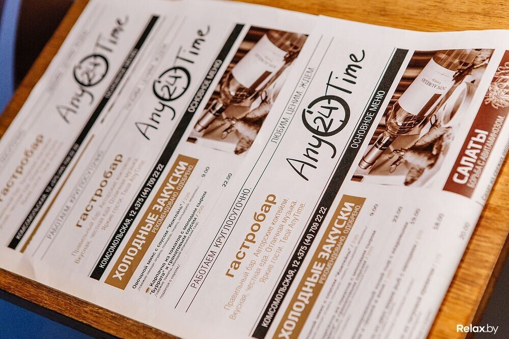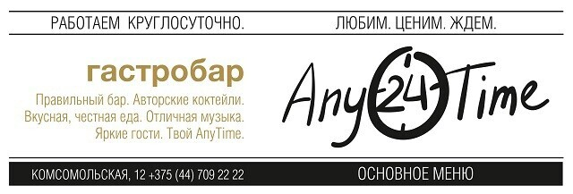 Очередной обзор Relax.by посвящен гастробару AnyTime на Комсомольской, 12: вкусно поесть в нем можно в любое время дня и ночи, винил на диджейском пульте крутится каждый день, а с четырех утра в выходные сюда можно заглянуть на after morning-party после тусовки в клубе.