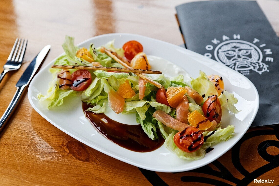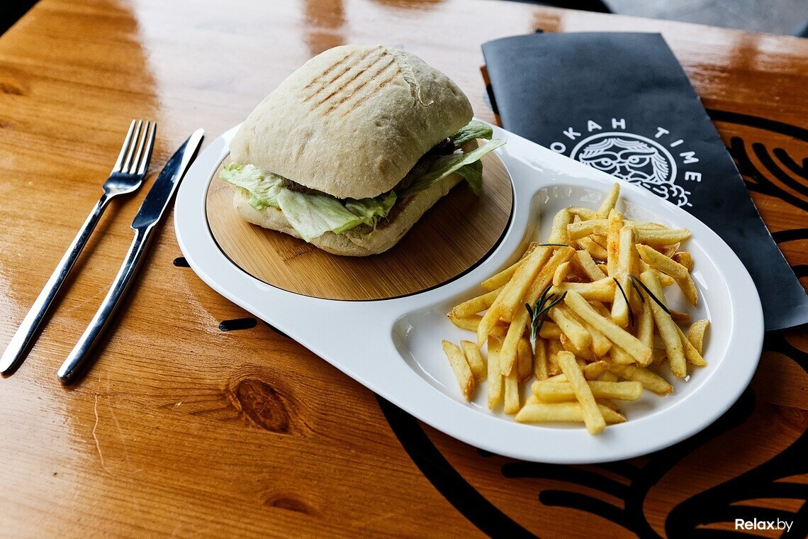 Кальянное меню включает более 100 позиций, а в баре можно попробовать более 15 авторских коктейлей. Также заведение предлагает широкий выбор чая: более 30 сортов. В меню Hookah Time представлены блюда европейской и американской кухни: бургеры (в том числе, веганский), авторские пивные сеты и салаты. В заведении нет отдельного обеденного меню, но с 12:00 до 17:00 действует скидка -15% на меню кухни. А именинникам предоставляется скидка на кальян: -10%.