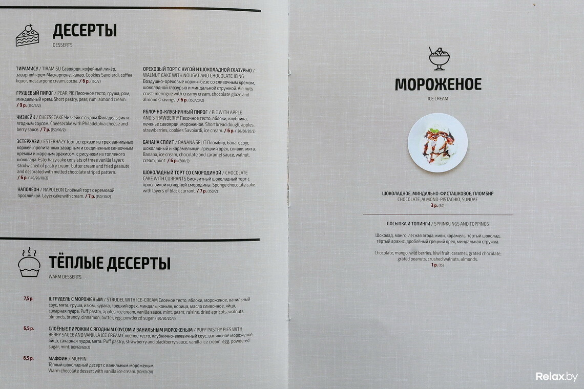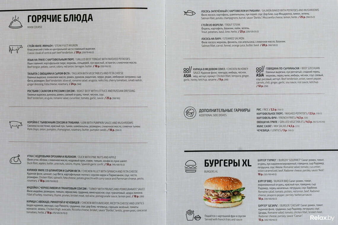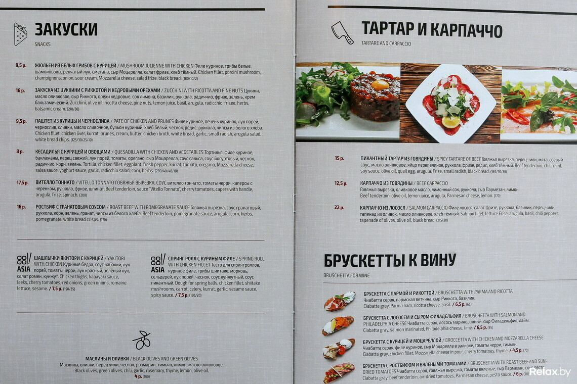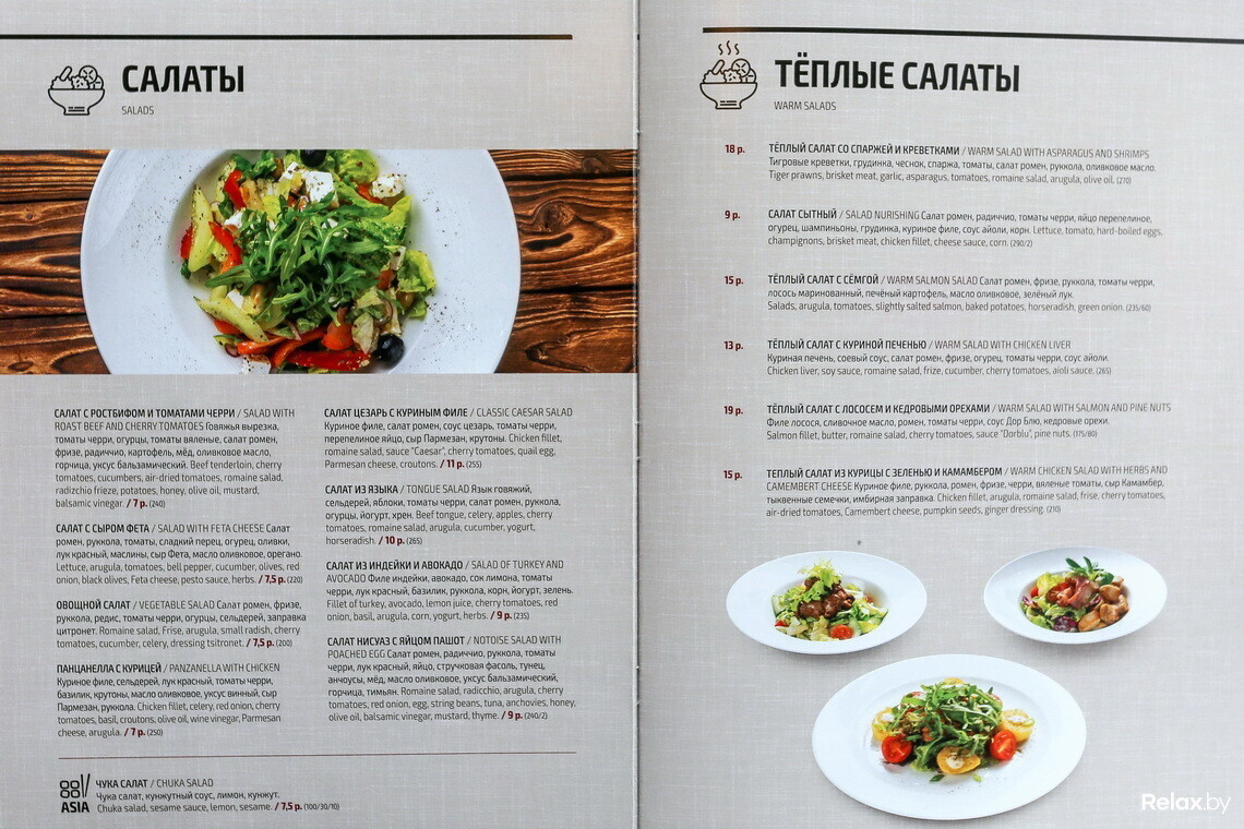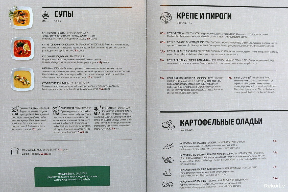 Во внушительном меню оставили лишь классику; новинки появились во всех разделах. Главная из них — паназиатская кухня. Упор сделали на авторские коктейли, однако классику готовят по просьбе гостей.