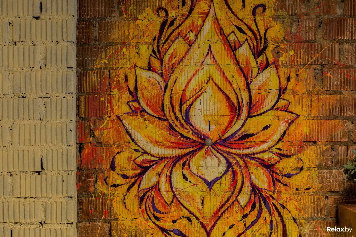Рисунки на стенах Бикаш также придумал сам, а воплотить их в жизнь помогли минские девушки, занимающиеся творчеством и увлекающиеся йогой. «Некоторые рисунки пришлось переделывать несколько раз, потому что я хотел сделать все не быстро, а правильно. Поэтому приходилось рассказывать девушкам, почему, например, эта линия должна быть изогнута в одну сторону, а та — в другую».