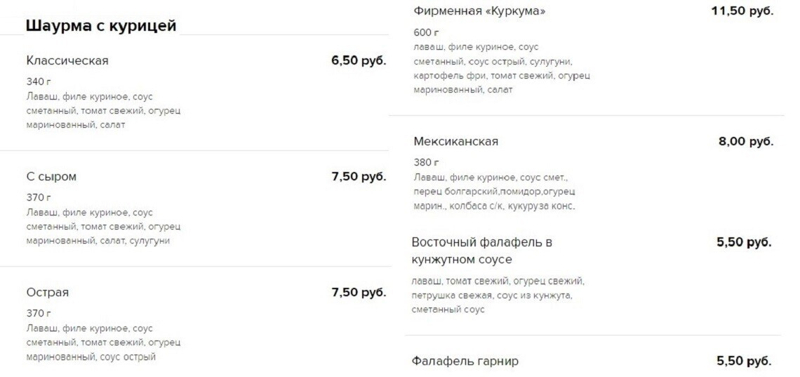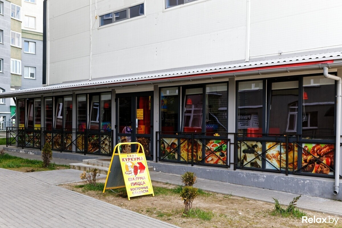 Кухня в «Куркуме» — переплетение Востока и Запада. Тут широко представлена сирийская и в целом восточная: есть шаурма, фалафель, настоящие восточные сладости (особенно рекомендуют попробовать намора, маамуль и миндальное печенье). Шеф-повар «Куркумы» — сириец Ихаб Джахджах, знакомый минчанам по заведениям BAR 13 и Royal Kebab & Salads.