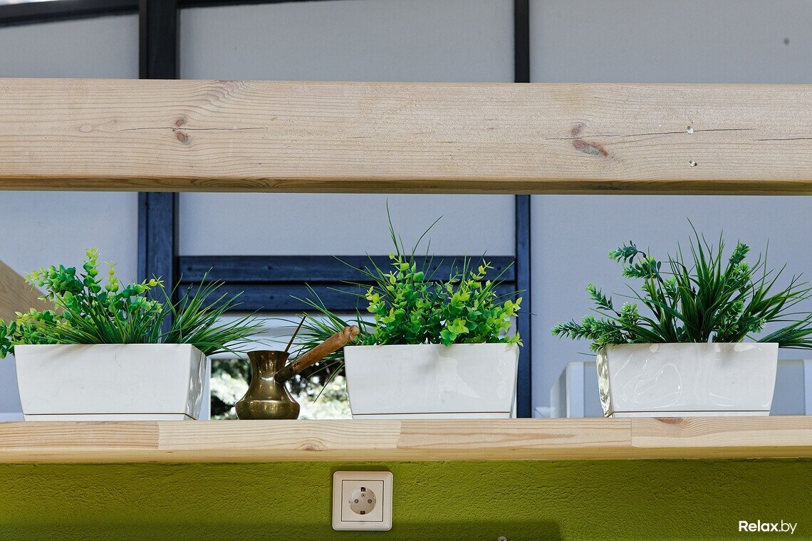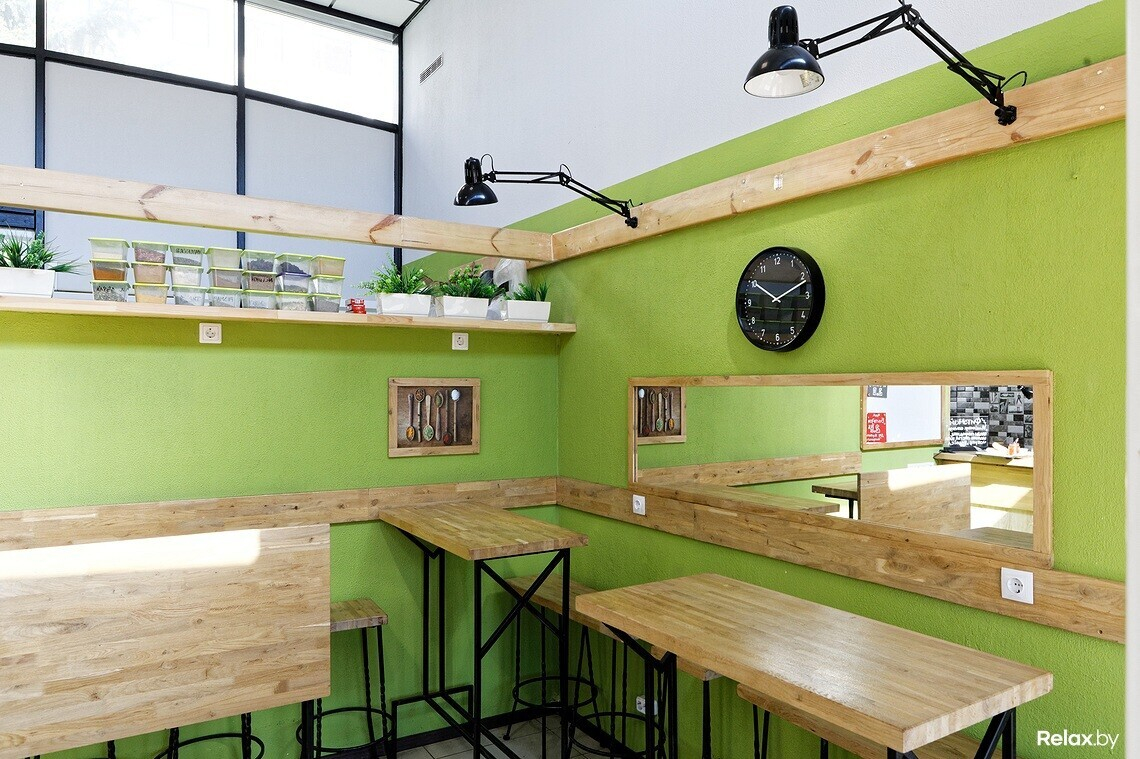 Интерьер выдержан в стиле минимализма: простые столы и стулья, элементы декора из дерева, зеленый и салатовый цвета в оформлении стен. Уюта добавляют комнатные растения.