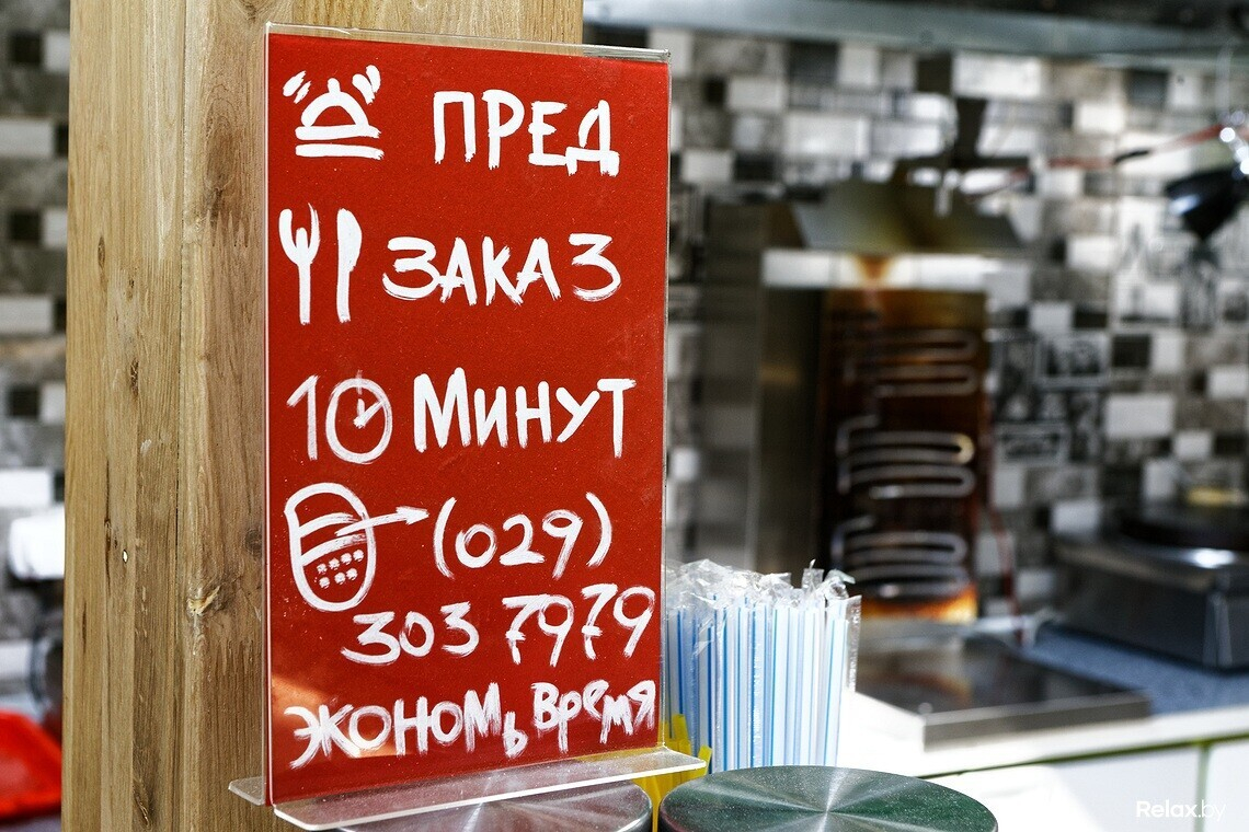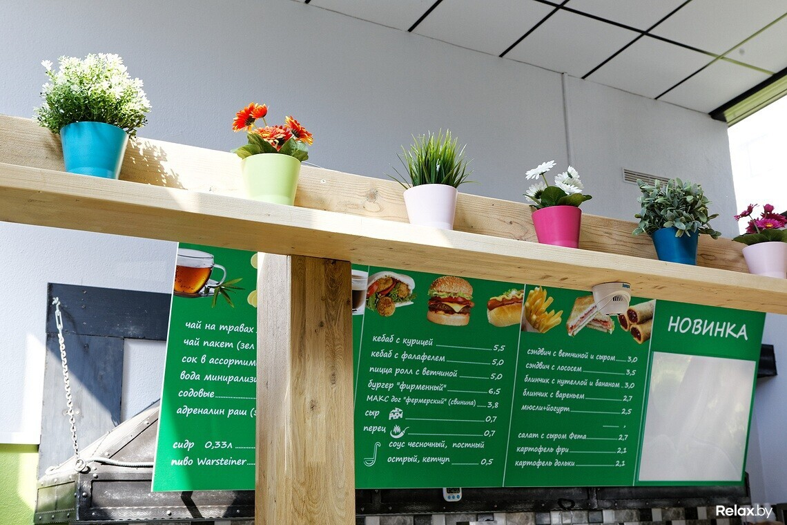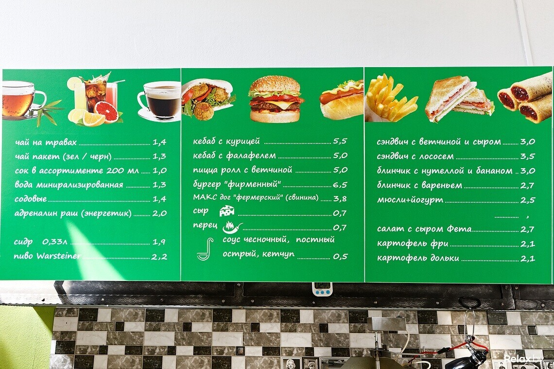 В меню заведения — популярные блюда уличной кухни: кебабы, бургеры, хот-доги, пицца, блинчики, сэндвичи и картофель фри. Из горячих напитков посетителям предлагают черный, зеленый и фирменный травяной чай. Кофейное меню представлено традиционными американо (от 1,9 руб.), эспрессо (от 1,8 руб.) и латте.